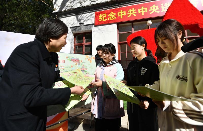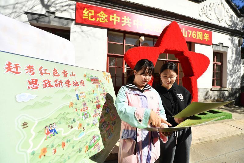 同时,香山公园向参加活动的同学展示并赠送新推出的《赶考红色香山思政研学地图》,地图以手绘插画的形式展现春意盎然的香山革命旧址研学点位。“在这份地图中,我们还放置了8处革命旧址的语音导览二维码,同学们可以跟着地图边参观边聆听语音介绍开展学习。”